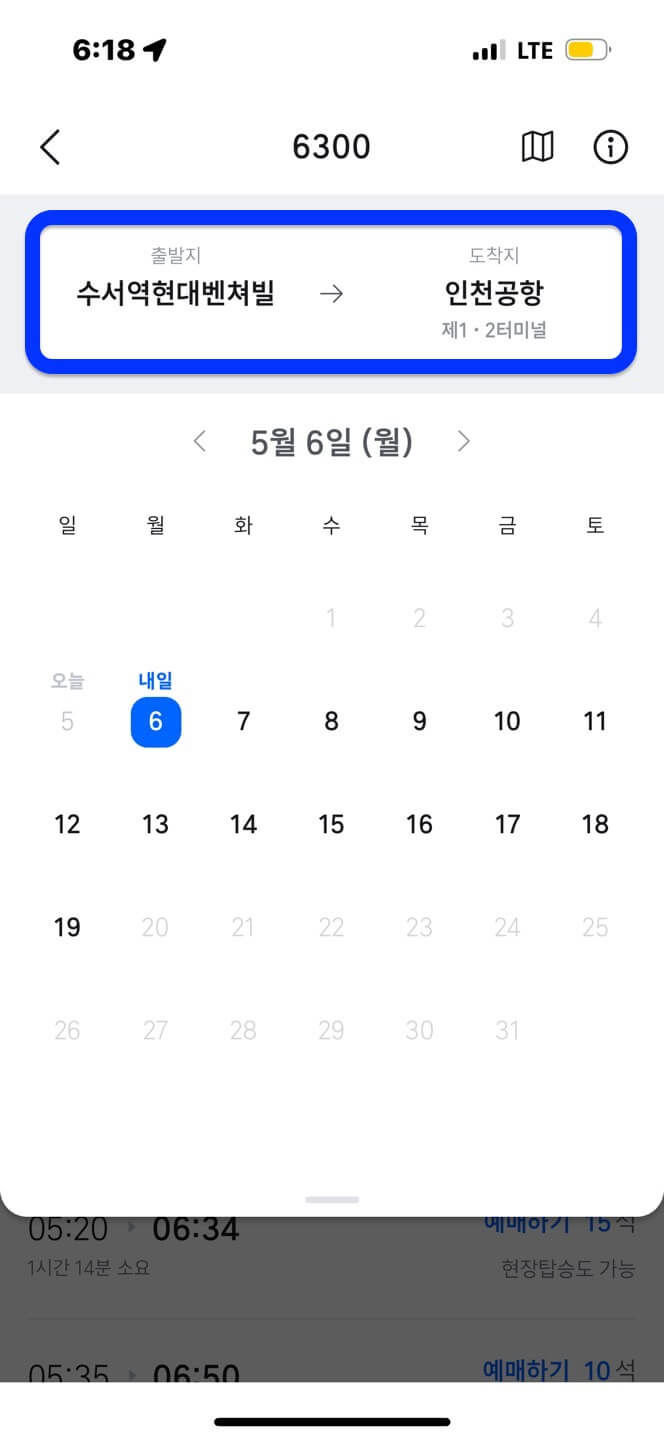 5. 아래 공항버스 노선을 확인하고 원하는 출발지를 선택합니다.