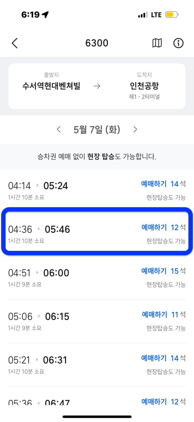 5. 아래 공항버스 노선을 확인하고 원하는 출발지를 선택합니다.