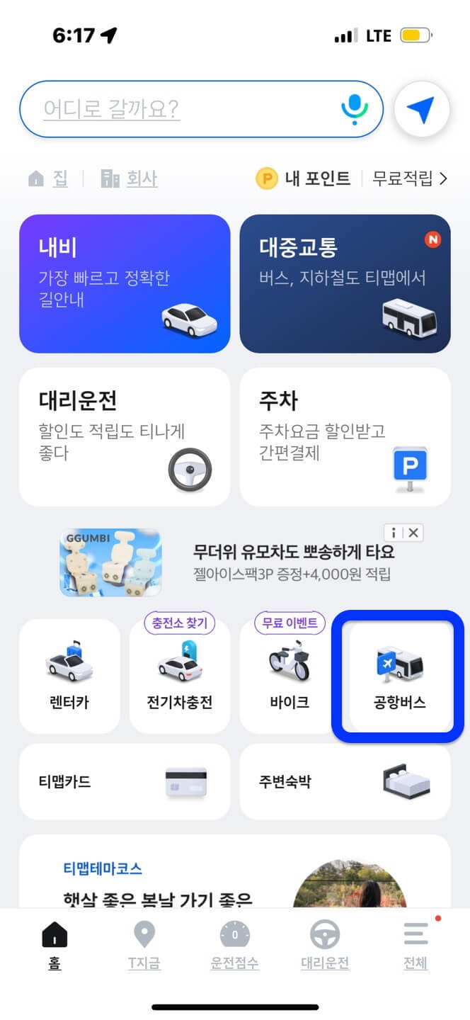 2. 티맵 로그인 후에 우측 하단에 보이는 [공항버스]를 탭 합니다.