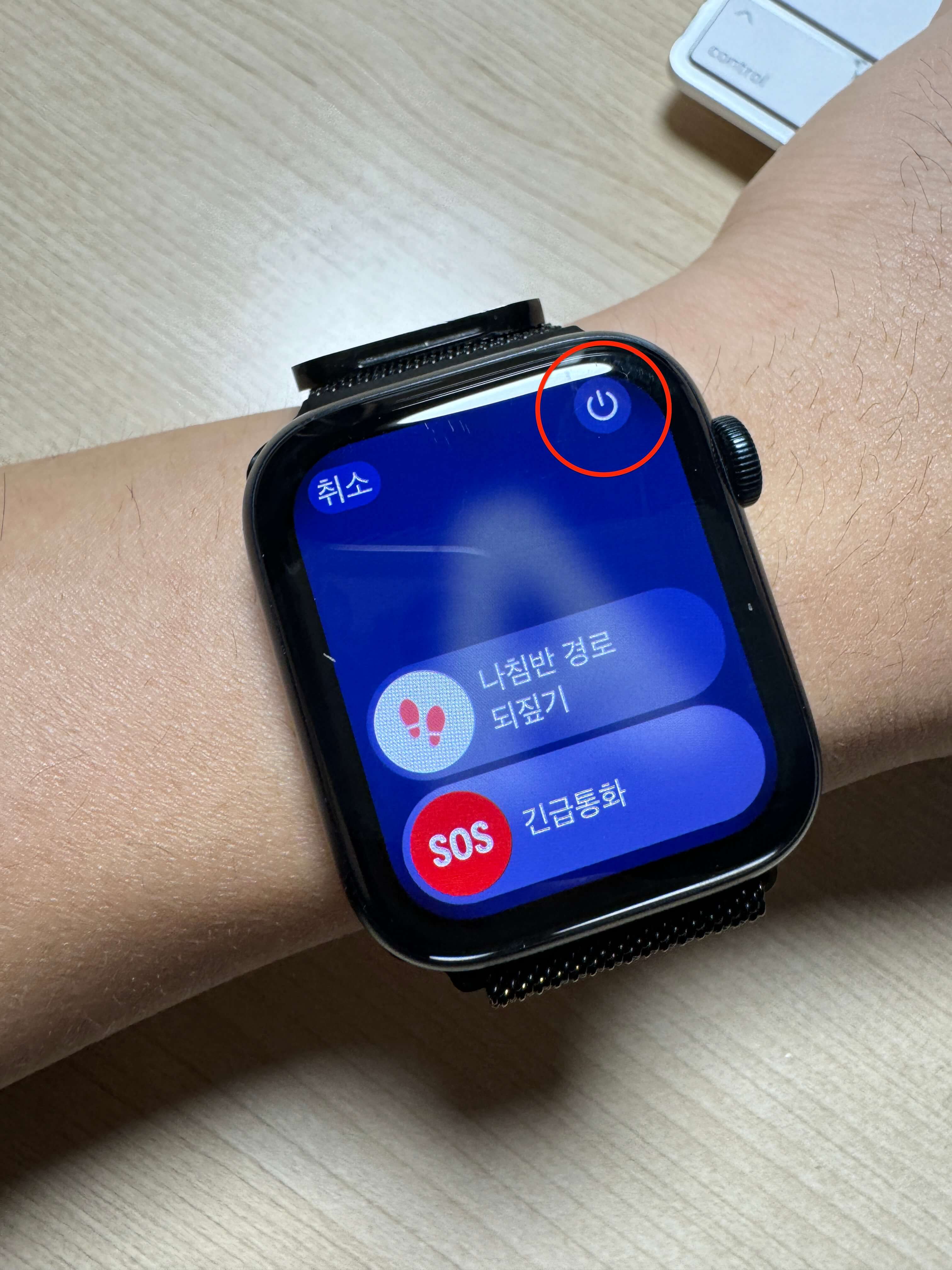 애플워치 좌측 하단에 보이는 측면 버튼을 길게 누른 후, 화면 상단 우측에 전원 버튼을 누릅니다.