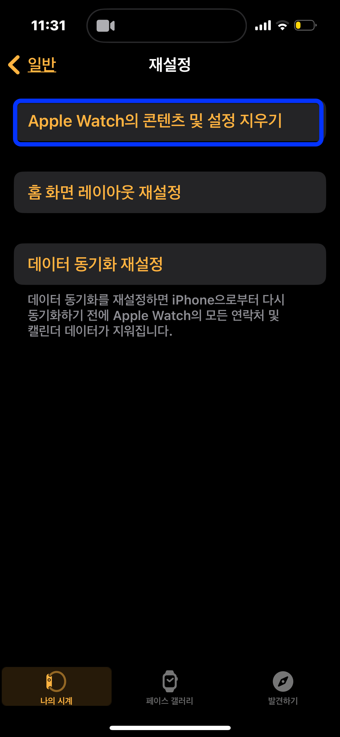 6. [모든 콘텐츠 및 설정 지우기]를 누르면 본인이 사용한 정보와 애플워치의 콘텐츠를 삭제할 수 있습니다.