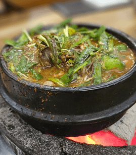 된장찌개 위에 올라간 부추와 냉이 그리고 고기가 듬뿍 들어가 된장찌개 깊은 맛의 최고치를 달합