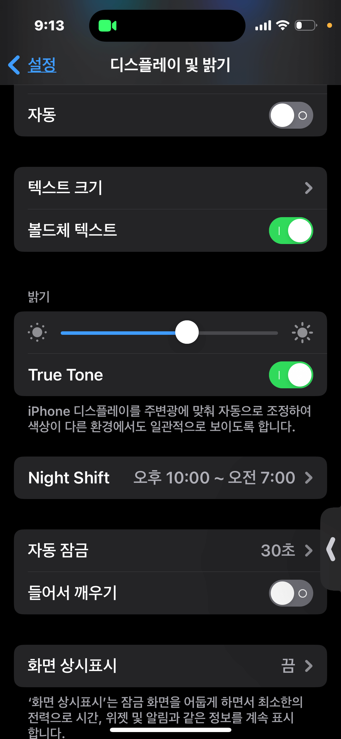 5. 아이폰 설정에서 [디스플레이 및 밝기]에 들어가 [자동]을 끄고, [True Tone]을 끕니다.