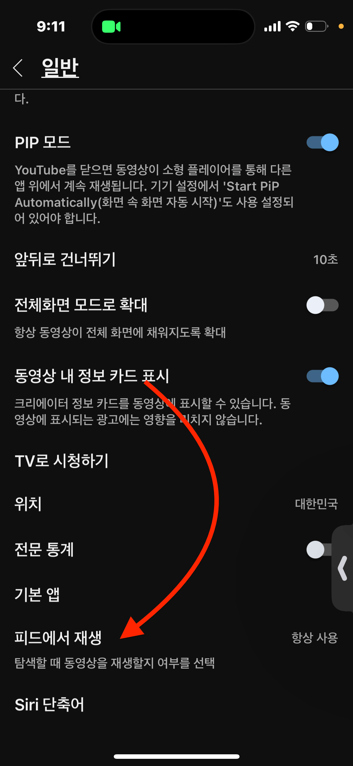 3. [설정]에서 [일반]에 들어가 [피드에서 재생]을 누릅니다.