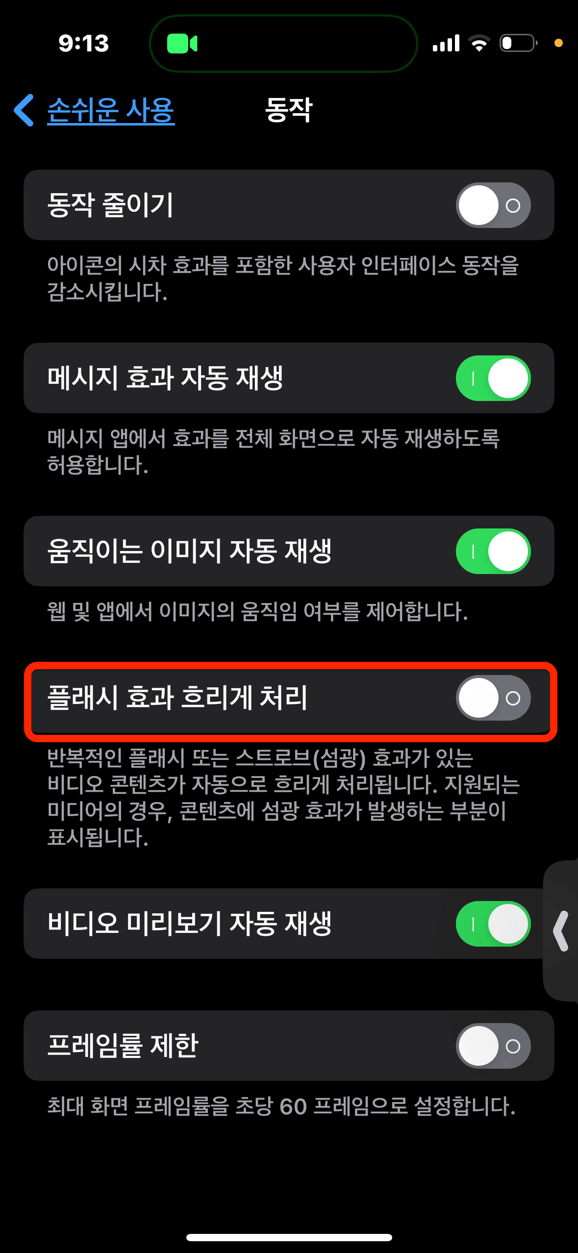 6. [설정] - [손쉬운 사용] - [동작] - [플래시 효과 흐리게 처리] OFF