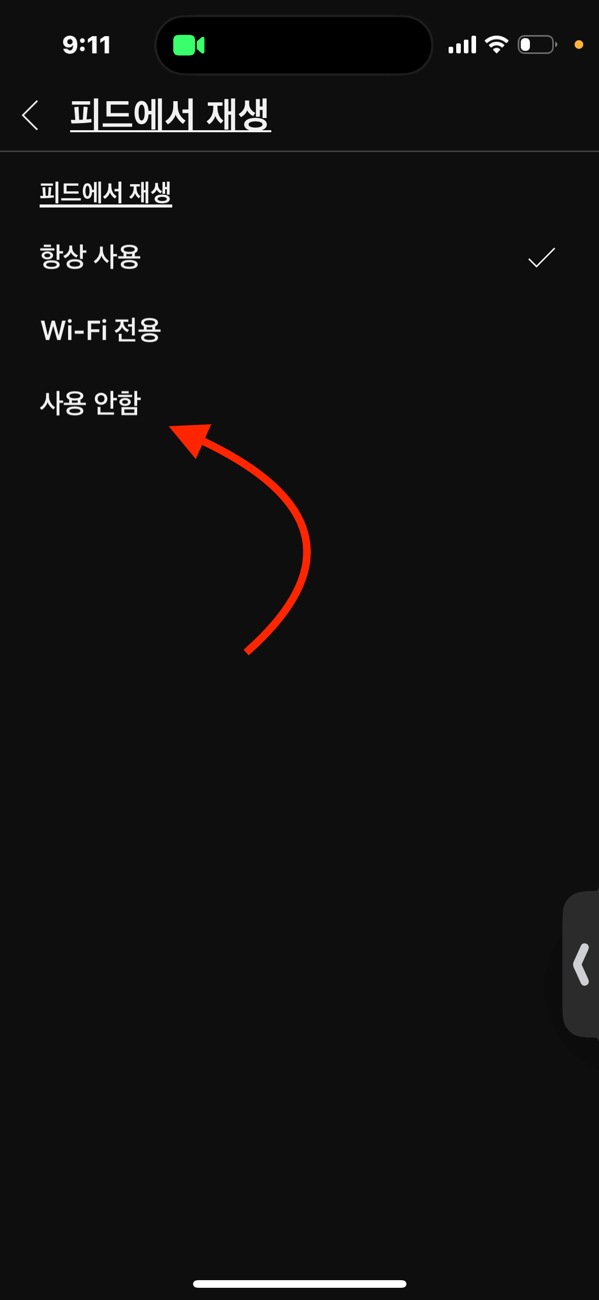 4. [피드에서 재생] 화면 창에 보이는 항상 사용, 와이파이 전용, 사용 안 함 중 맨 마지막 사용 안함을 선택합니다.
