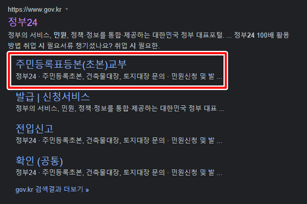 *이 방법도 까다로우시다면 구글 검색 정부 24를 검색하면 바로 하단에 주민등록표등본(초본) 교부가 바로 뜹니다.