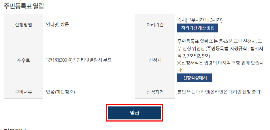 4. 접속한 후에 바로 보이는 발급 버튼을 누르면 열람에서 전입일을 바로 확인하실 수 있습니다.