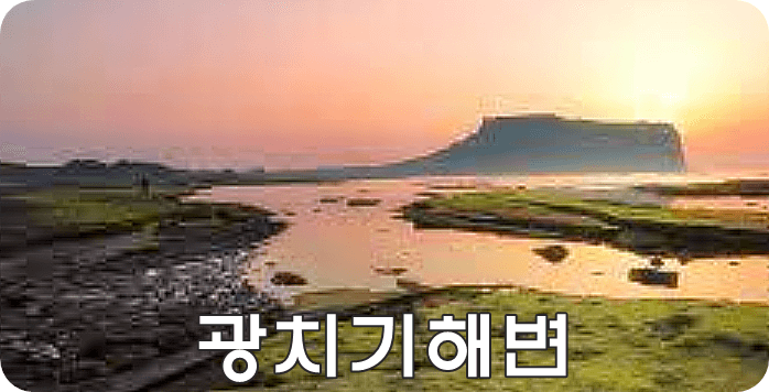 서귀포시에 위치하고 있는 해변입니다. 광치기 해변은 동부지역에서 꽤 아름다운 해변으로 유명한 곳이기도 하죠. 광치기 해변의 풍경은 용암으로 만들어진 '성산일출봉'을 바라볼 수 있습니다. 바닷물도 정말 깨끗하고, 휴양지 분위기가 나는 명소입니다.